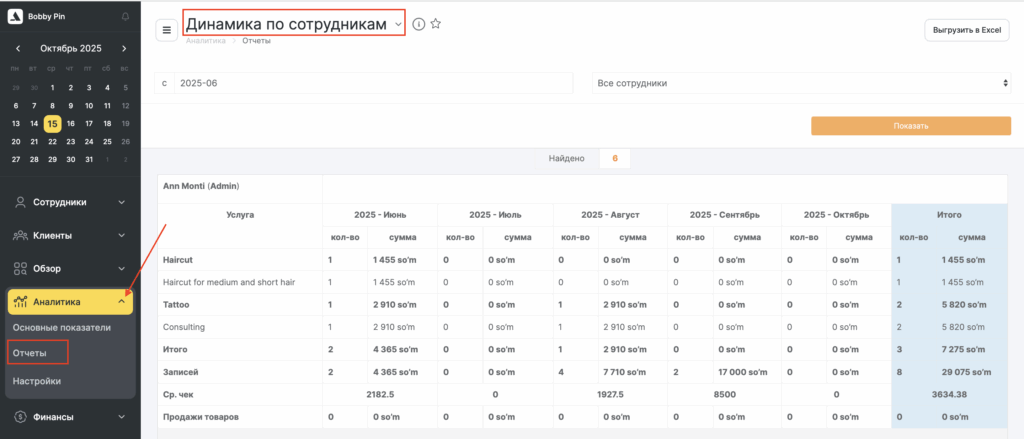 В разделе «Аналитика» > «Отчеты» > «По сотрудникам в динамике» вы можете увидеть отчет о деятельности каждого сотрудника за каждый месяц: