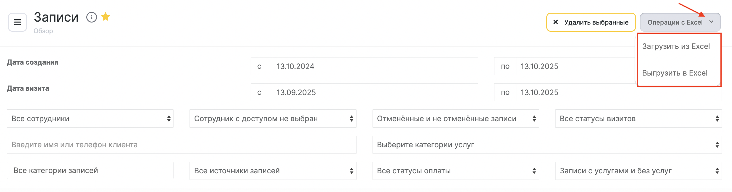 Данные о записях можно выгружать в Excel, а также загрузить список из Excel.