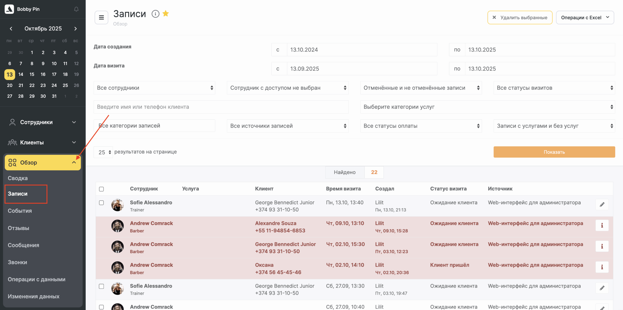 Отфильтруйте список по необходимым пунктам и нажмите кнопку «Показать». Также можно искать записи по конкретному клиенту, для этого введите имя или номер телефона и нажмите кнопку «Показать».