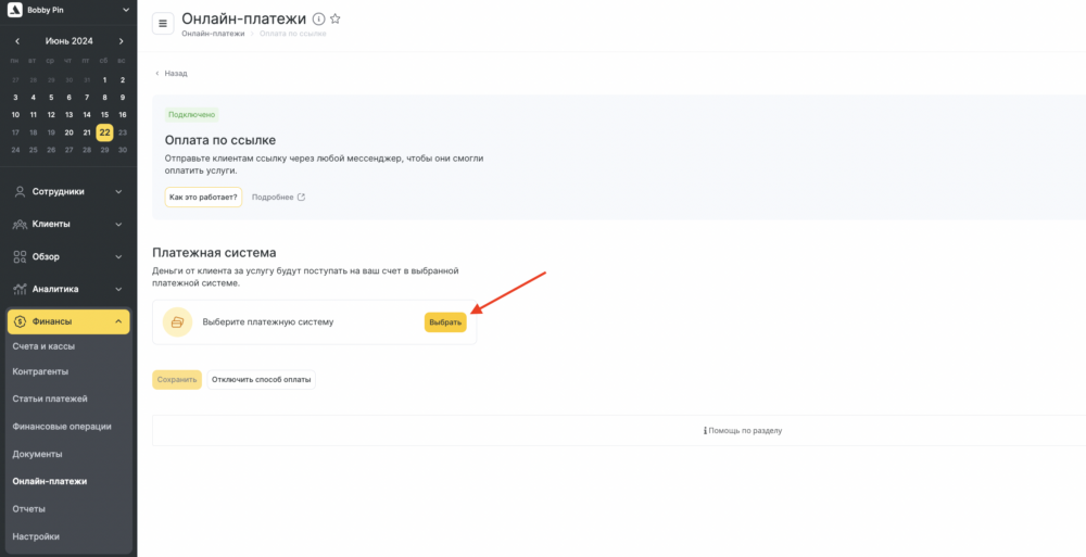 После подключения и настройки системы приема онлайн-платежей, становится доступной опция «Оплата визитов по ссылке». При необходимости ее можно включать и отключать в разделе «Финансы» > «Безналичная оплата».
