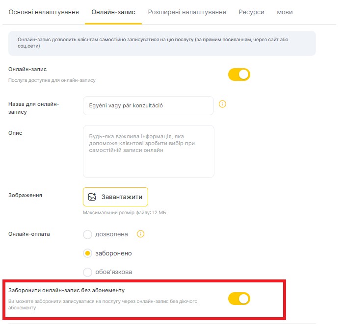 • Якщо у Вашому філіалі включена Обов’язкова або необов’язкова оплата при онлайн записі, то налаштування онлайн-запису без абонементу стане доступним тільки після відключення онлайн-оплати.