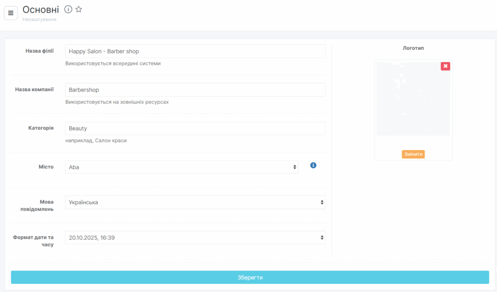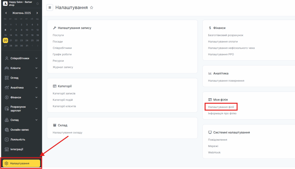 Перейдіть у головному меню до розділу «Налаштування» > «Моя філія» > «Налаштування філії».