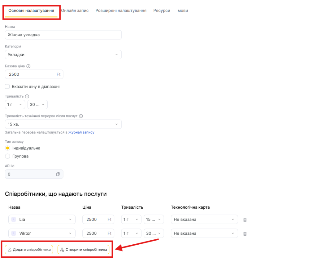 - Щоб додати співробітника до послуги, перейдіть на вкладку Основні налаштування у налаштуваннях послуги.