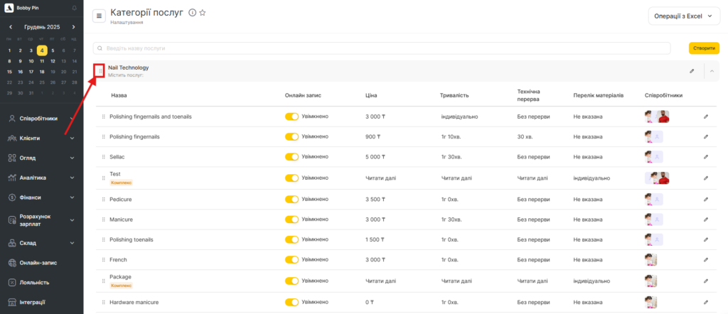 Після того, як «Категорії» додані та налаштовані, додайте та налаштуйте «Послуги» в кожній категорії.