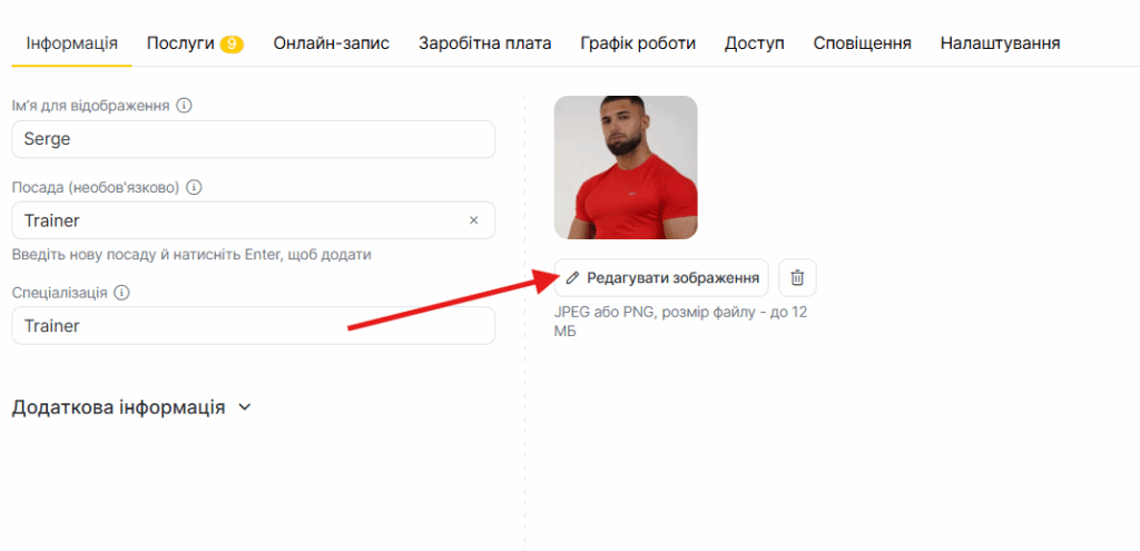 Щоб додати фото співробітника, яке клієнти бачитимуть у віджеті онлайн-запису, а також відредагувати або внести додаткову інформацію: