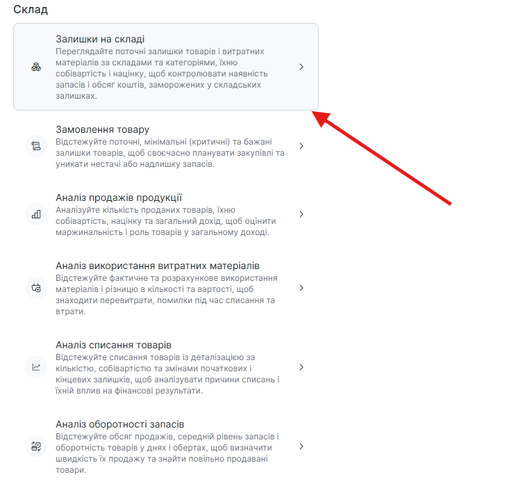 Звіт про залишки на складі можна переглянути в розділі Звіти> Всі звіти > Склад > Залишки на складі.