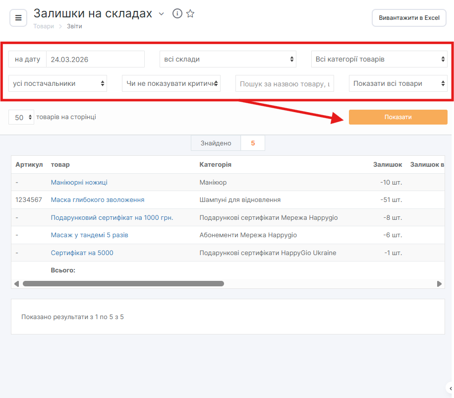 Для формування звіту перейдіть до розділу Звіти> Всі звіти > Склад > Залишки на складах. Відфільтруйте лист за необхідними пунктами та натисніть кнопку Показати.