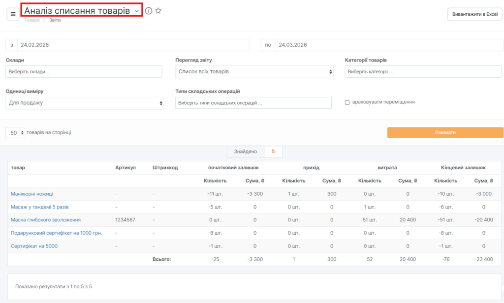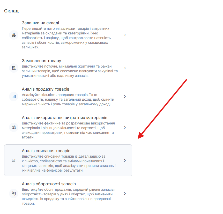 Звіт зі списання товарів можна переглянути в розділі Звіти > Всі звіти > Склад > Аналіз списання товарів або у розділу Товари > Звіти > Аналіз списання товарів