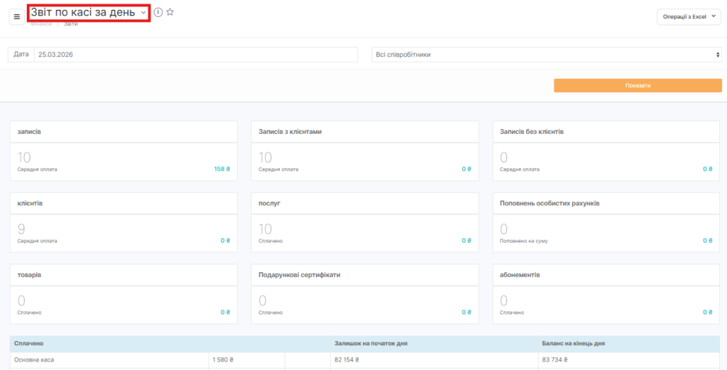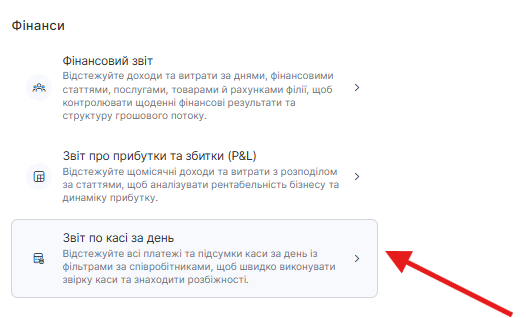 Щоб автоматично створити звіт, у режимі Адміністрація перейдіть до розділу Звіти > Всі звіти > Фінанси > Звіт по касі за день.