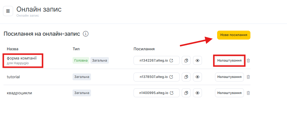 - Виберіть потрібне посилання онлайн-запису та натисніть на його назву або кнопку Налаштувати, щоб перейти в режим редагування.