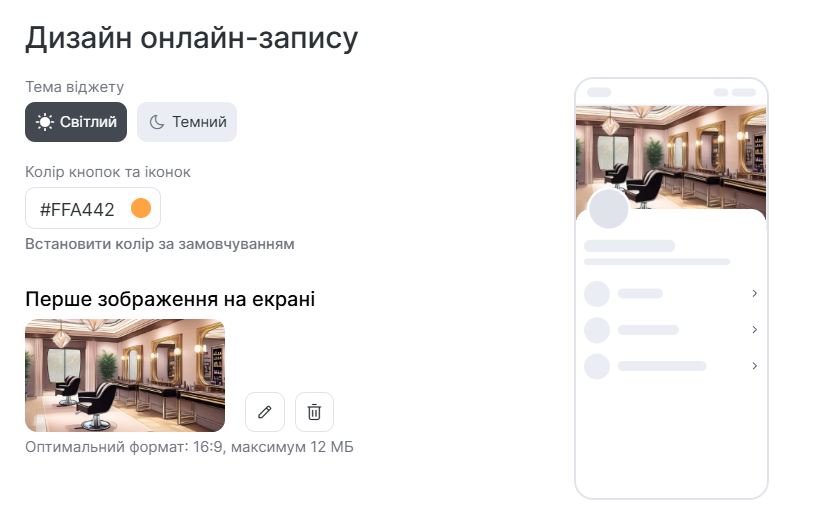 В Altegio можна встановити будь-який колір інтерфейсу, налаштувати дизайн віджета під свій бренд, додати логотип та зображення.