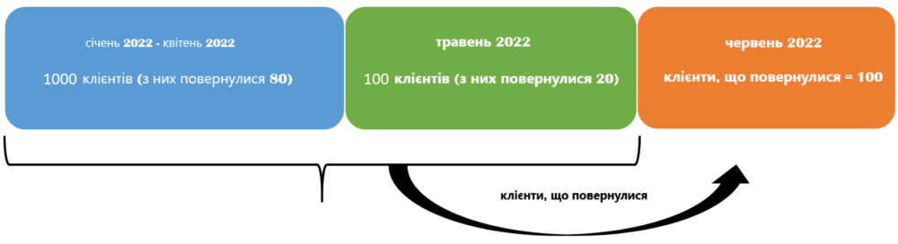 Якщо в минулому періоді було 100 клієнтів, а в поточному періоді з них прийшло 20, то «Повернення» дорівнює 20%.
