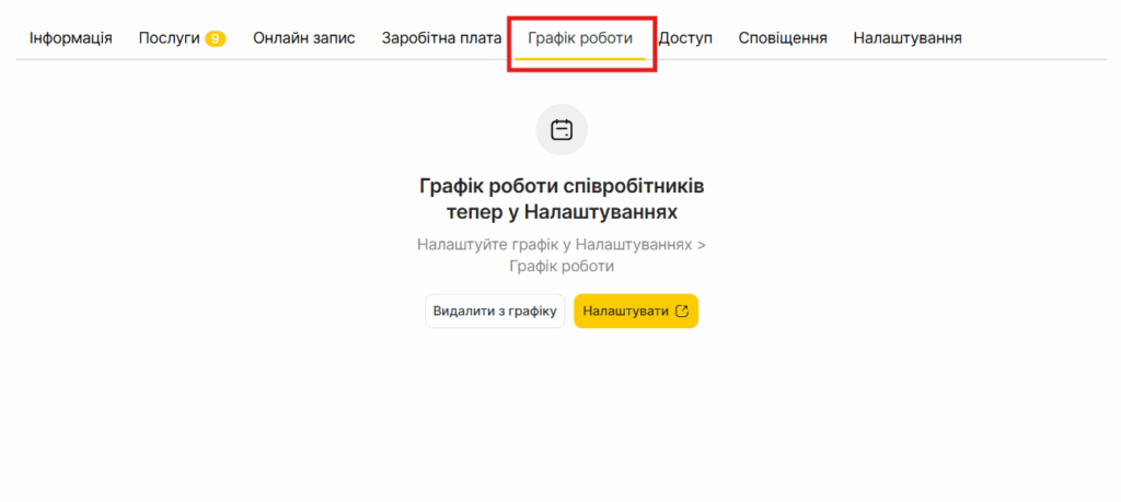 Натисніть «Видалити з графіка», щоб відв’язати фахівця від призначеного розкладу (з’явиться повідомлення для підтвердження).
