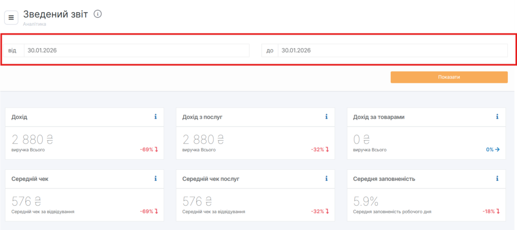 Показники формуються за заданим періодом, вкажіть дати та натисніть кнопку Показати.
