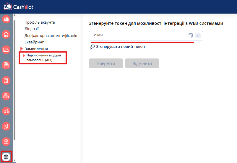 Токен — дані ви можете взяти в кабінеті Cashalot, у розділі “Налаштування” – “Інтеграція з WEB-системами”.