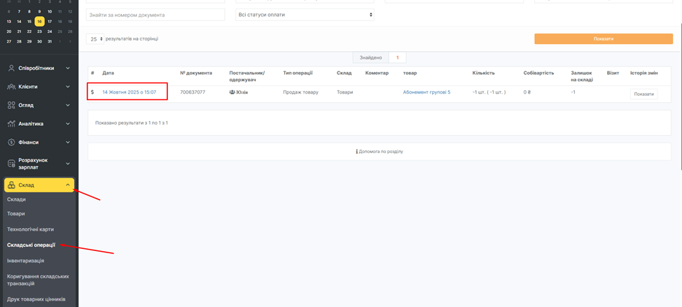 Переходимо у Склад – Складські операції і натискаємо на дату операції продажу.