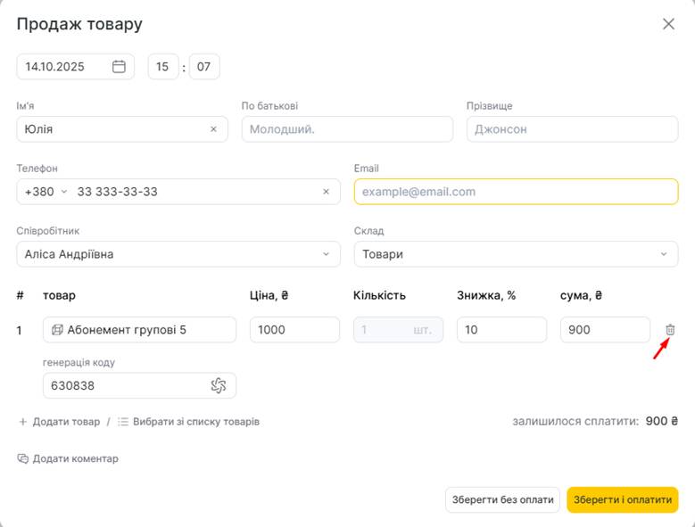 Після цього,у відкритому вікні продажу натискаємо на смітник навпроти Абонемента/Сертифіката.