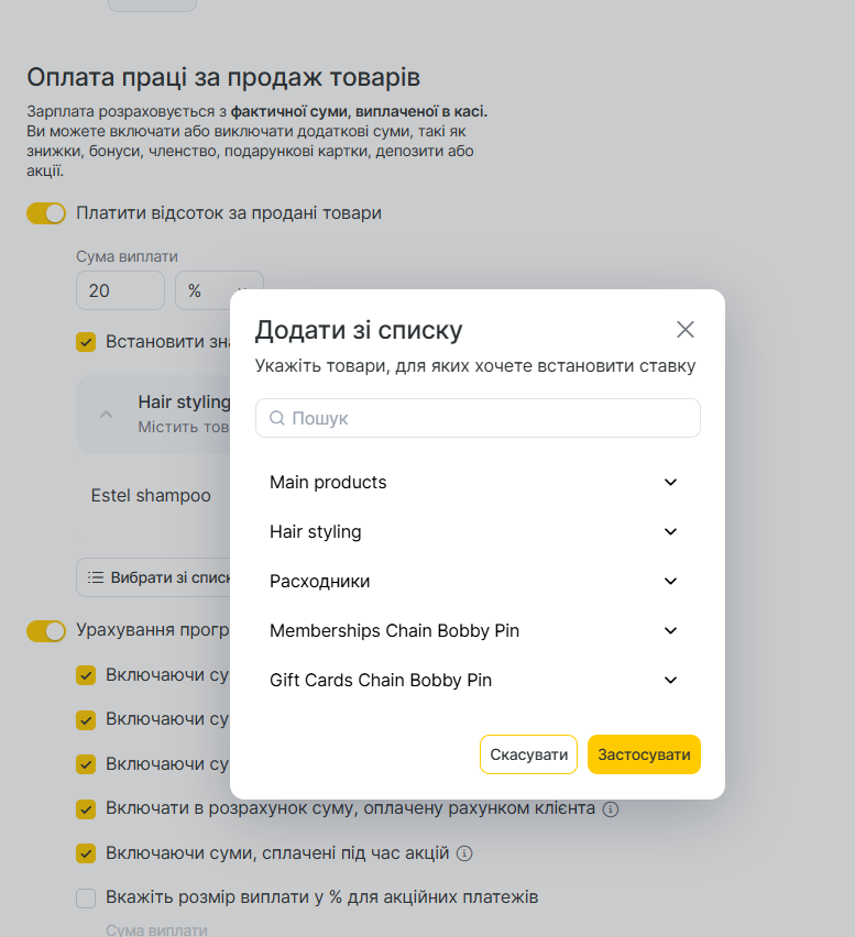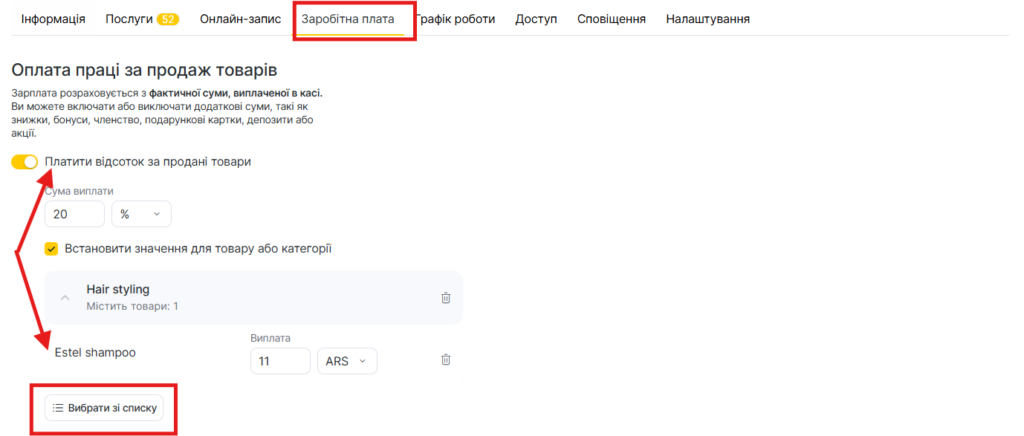1. Увімкніть опцію Виплата за продані товари, якщо співробітники отримують комісію з продажу роздрібних товарів.