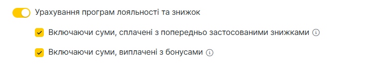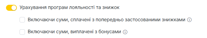 • Попередньо застосована знижка клієнта — чи враховувати суму, яка була зменшена через знижку