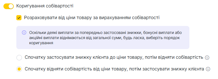 Увімкніть опцію Облік собівартості, щоб виплата розраховувалася від ціни товару за вирахуванням собівартості, наприклад витрат на матеріали.