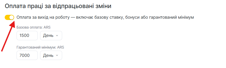 1. Увімкніть опцію Оплата за вихід на роботу, яка може включати базову оплату, додаткову винагороду або гарантований мінімум.