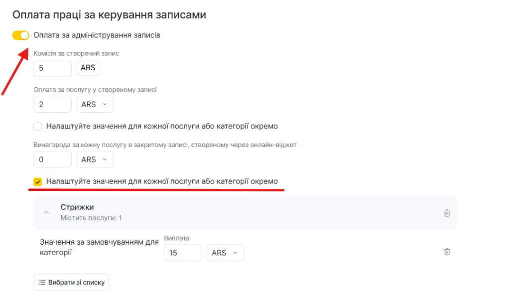• Послугу в створеному записі (у відсотках або у валюті). У цьому випадку нарахування здійснюються адміністратору, який створив запис.