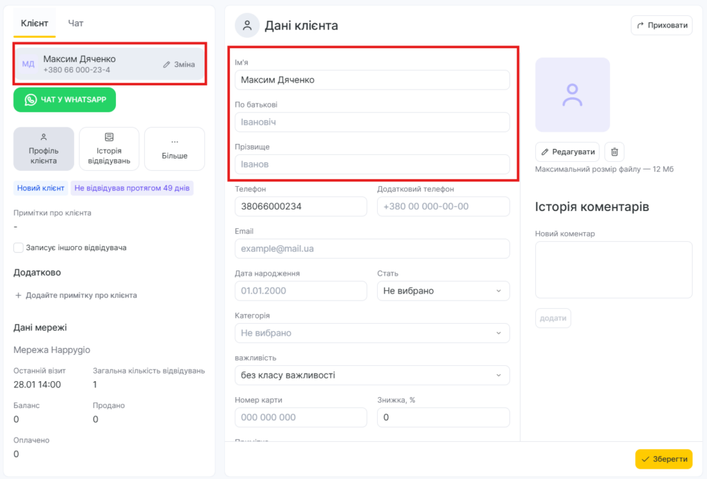 Після налаштування журналу запису в інтерфейсі взаємодії з клієнтом поруч з полем Ім’я з’являться нові поля – Прізвище та По батькові.