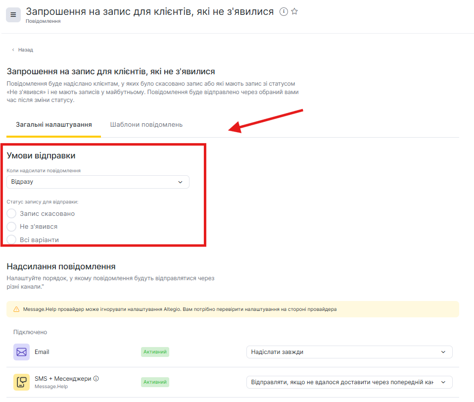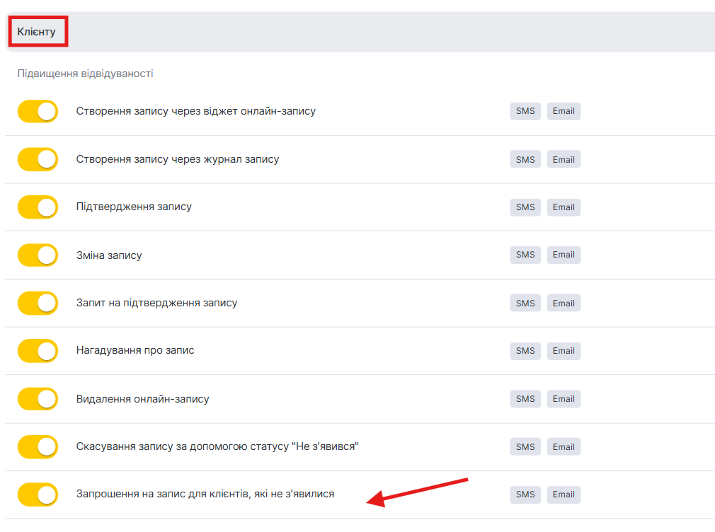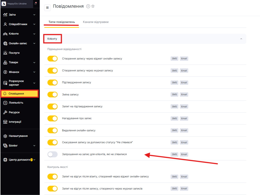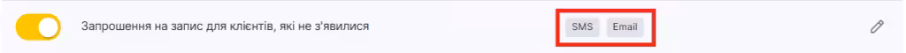 - У блоці Клієнту виберіть тип повідомлення Запрошення на запис для клієнтів, які не з’явилися, натисніть на ікону олівця для редагування.