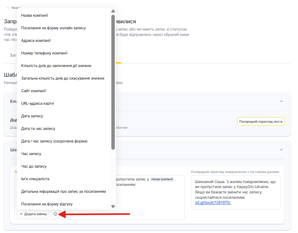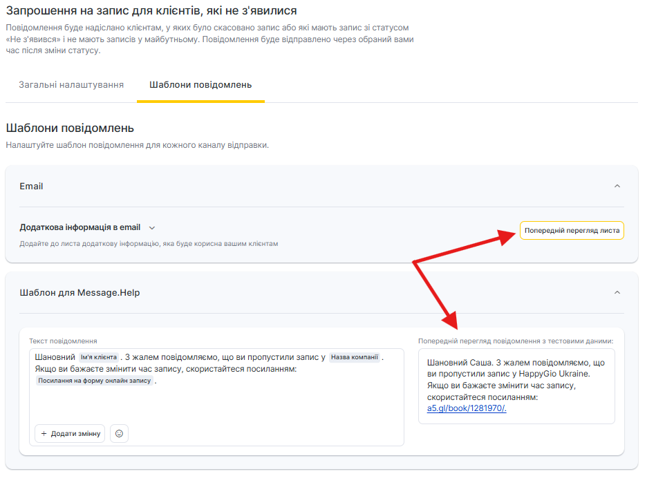 Для всіх шаблонів повідомлень доступний попередній перегляд — ви можете побачити, як виглядатиме повідомлення для клієнта, співробітника або адміністратора з урахуванням змінних.