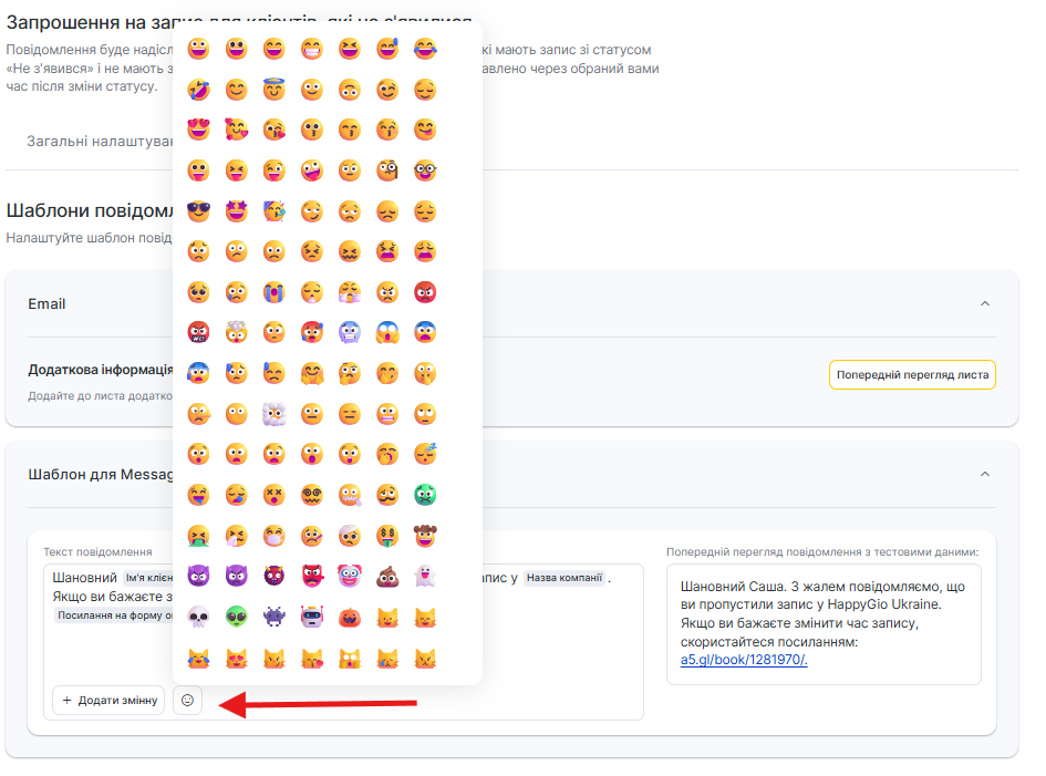 - У SMS-шаблонах повідомлень можна використовувати emoji. Для цього натисніть кнопку зі смайлом, оберіть потрібний із запропонованих або додайте власний.
