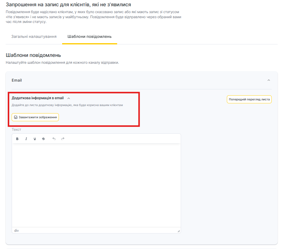 - у налаштуваннях шаблонів повідомлень перейдіть на вкладку Додаткова інформація в email