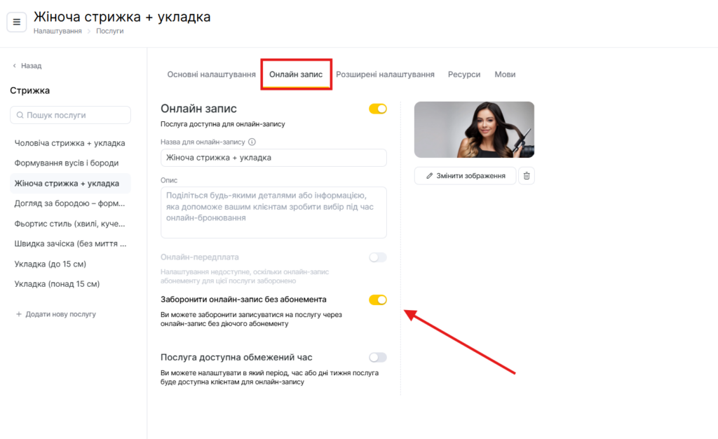 - Перейдіть на вкладку Онлайн-запис і прокрутіть сторінку вниз. Якщо послуга індивідуальна, увімкніть опцію Заборонити онлайн-запис без абонемента.