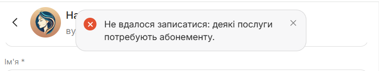- Якщо клієнт спробує записатися на послугу, на яку в нього немає абонемента, він побачить повідомлення: «У вас немає відповідного абонемента або строк його дії закінчився». Якщо в клієнта є активний абонемент на іншу послугу або абонемент вичерпаний / прострочений, записатися буде неможливо.