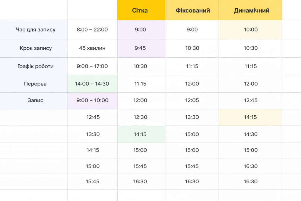 - Динамічний — додатковий слот створюється після завершення запису або перерви, а решта слотів підлаштовуються під нього. Підійде, якщо ви хочете забезпечити клієнтам максимальну гнучкість у виборі слотів.
