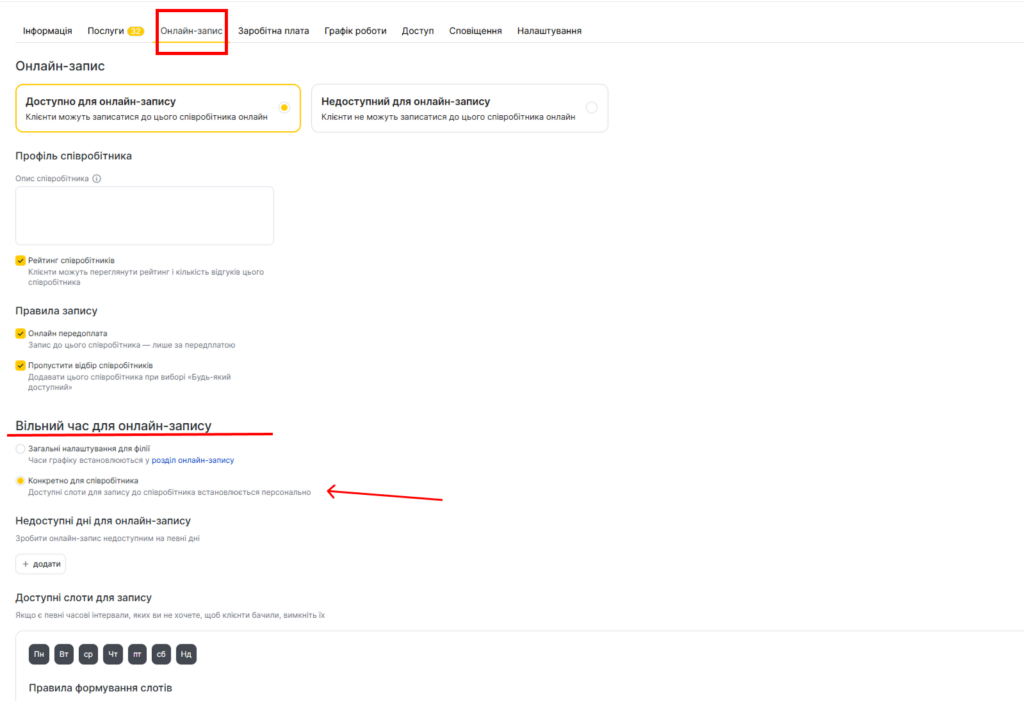 - Натисніть на ім’я співробітника в списку, відкрийте вкладку Онлайн-запис і виберіть Конкретно для співробітника у полі Вільний час для онлайн-запису.