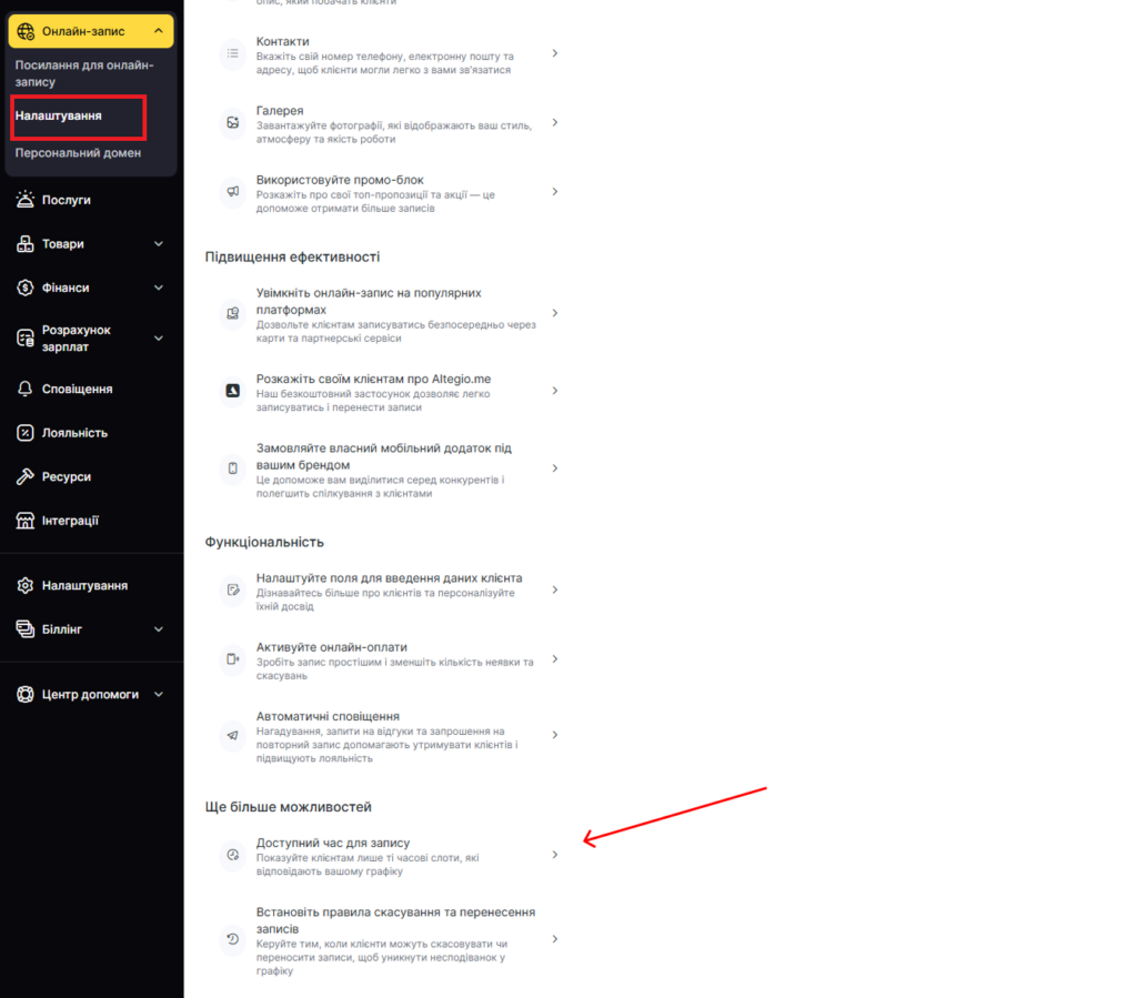 - Загальне для всіх співробітників філії — у розділі Онлайн-запис > Налаштування > блок Ще більше можливостей > Доступний час для запису.