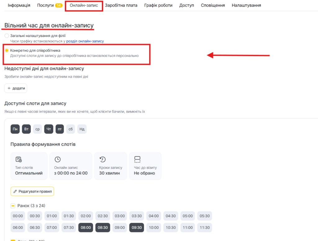Налаштування для філії та для співробітників є однаковими за логікою. Відмінність полягає лише в тому, що загальні налаштування діють для всіх співробітників, а персональні — тільки для вибраного співробітника. Для різних співробітників можна задати різні параметри доступного часу.