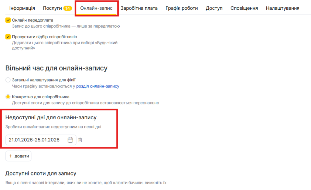Ви можете вимкнути онлайн-запис на конкретні дні або періоди. Наприклад, якщо в окремі дні ви плануєте приймати клієнтів лише офлайн. Це особливо зручно в передсвяткові дні для ручного керування записом.