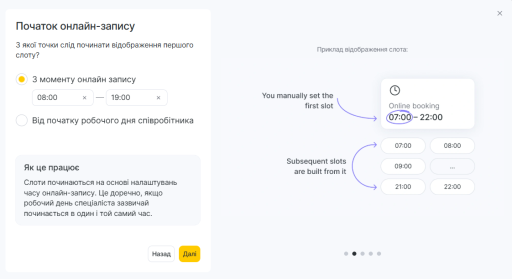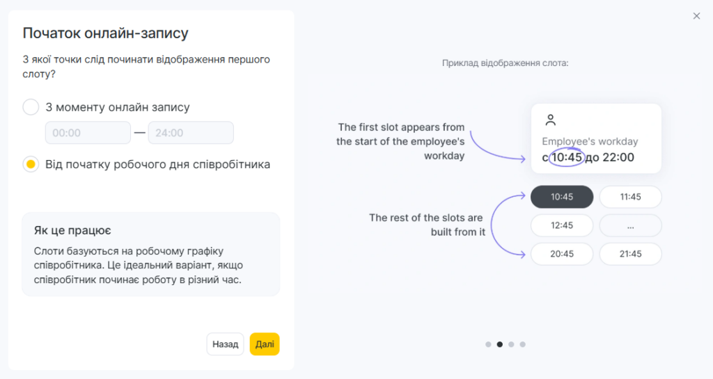 Виберіть, з чого починатиметься відображення першого часового слота для онлайн-запису: з часу онлайн-запису або з початку робочого дня співробітника.