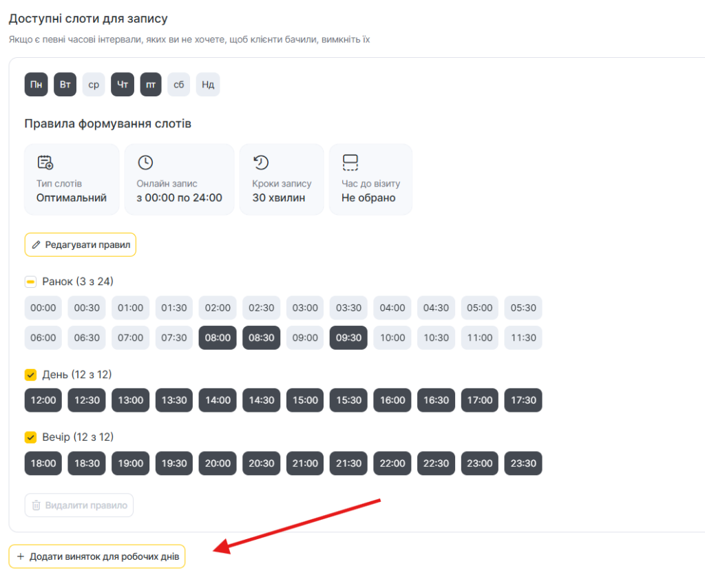 Можна приховати для онлайн-запису всі вечірні слоти, залишивши лише ранкові та денні.