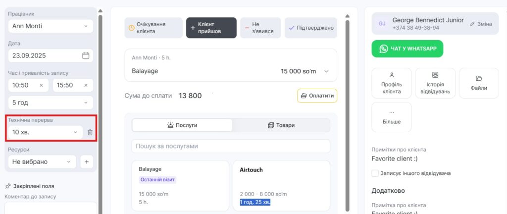 Приклад: у запис додані послуги «Стрижка» з техперервою 30 хв та «Зачіска» із загальною техперервою для всіх послуг 15 хв. Для такого запису буде автоматично додано техперерву — 30 хв.