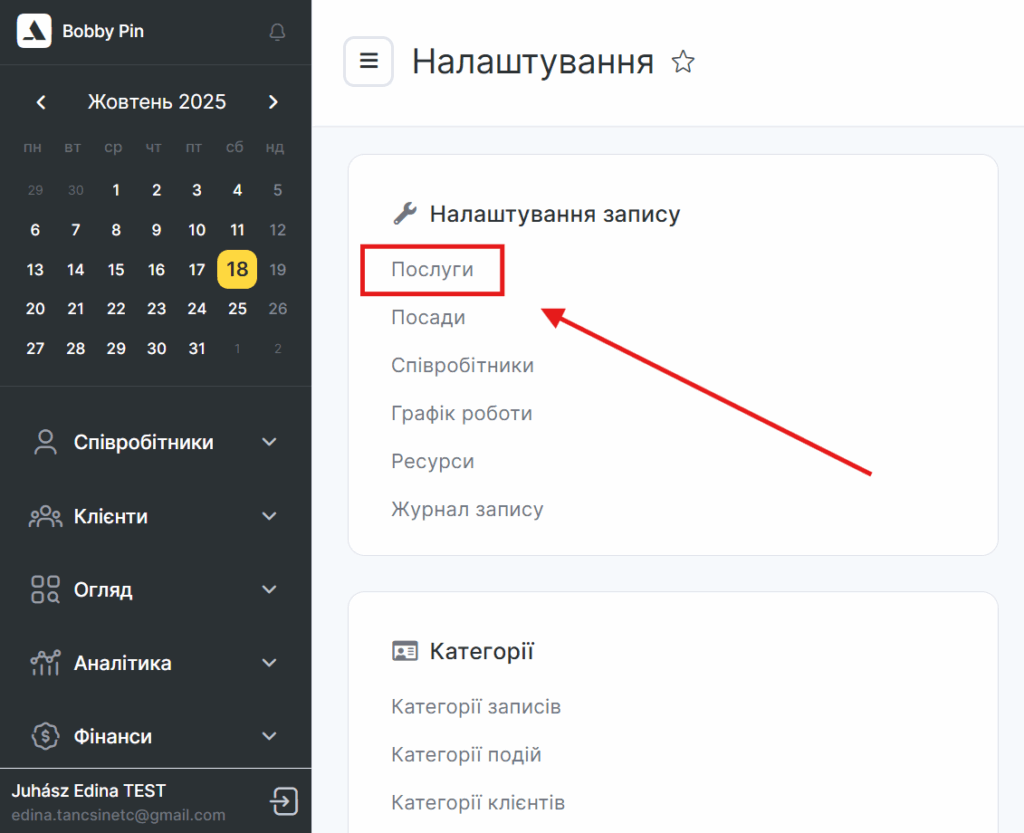 Перейдіть у головному меню до розділу Налаштування > блок Налаштування запису > Послуги.
