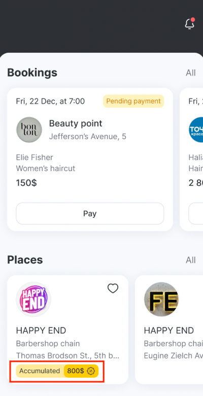 У мобільному застосунку Altegio.me з’явилася можливість показувати клієнтам накопичений ними кешбек. Ви можете налаштовувати гнучкі бонусні програми в мережевому інтерфейсі Altegio та мотивувати клієнтів частіше обирати вашу компанію завдяки відображенню бонусного балансу в застосунку.