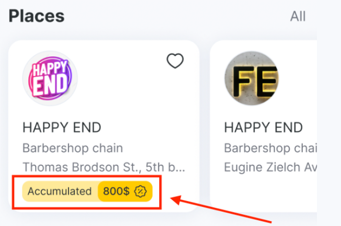 Якщо у клієнта є карта лояльності з накопиченим кешбеком, на головній сторінці застосунку в картці компанії відображатиметься його сума.