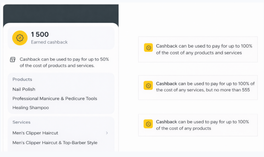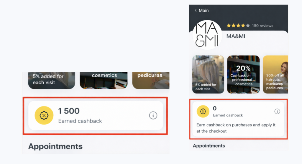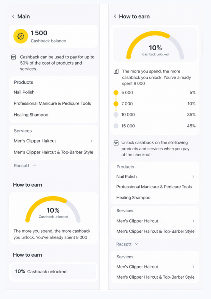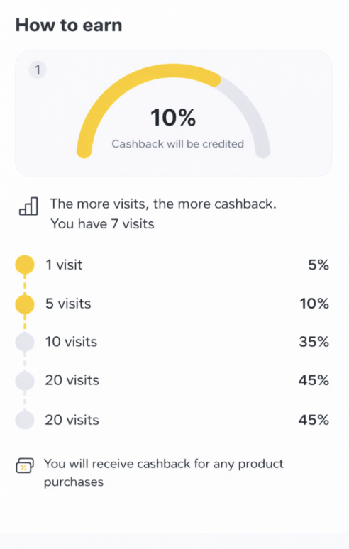 - Накопичувальні бонуси від кількості візитів — поточний розмір кешбеку (% або сума) та скільки візитів залишилося до переходу на наступний рівень отримання кешбеку.
