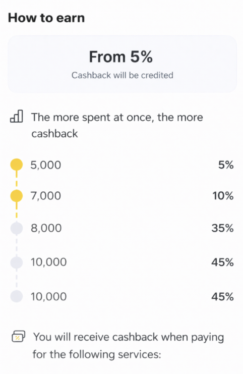 - Накопичувальні бонуси від суми — поточний розмір кешбеку (% або сума) та скільки залишилося витратити до переходу на наступний рівень отримання кешбеку.