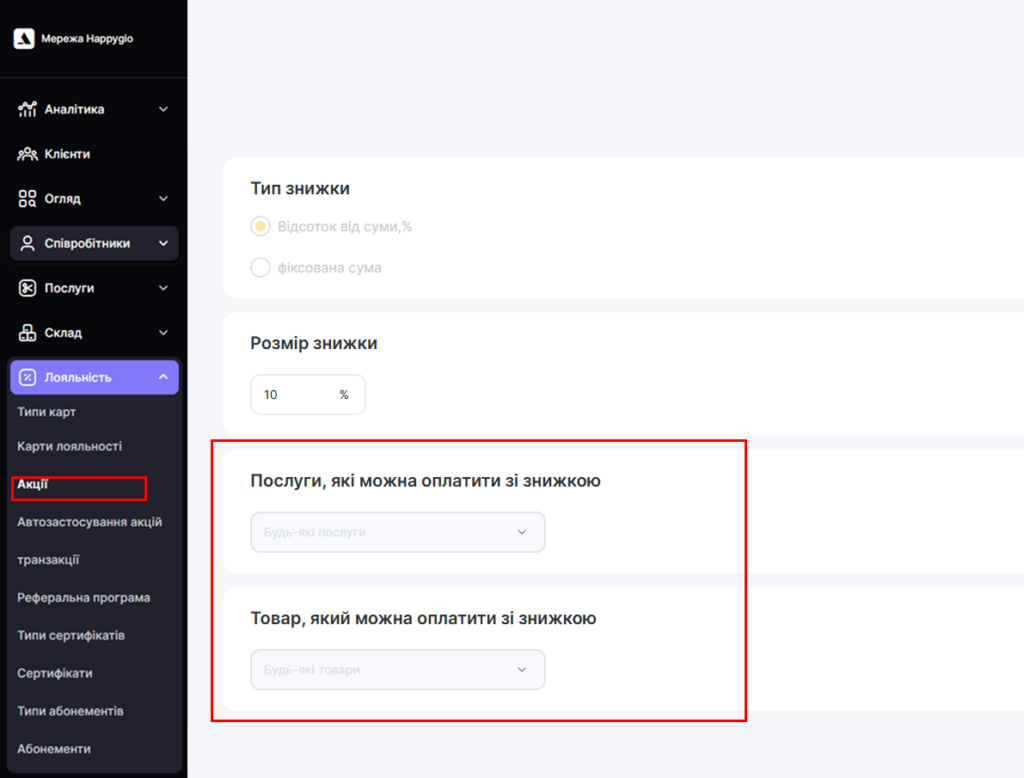 - Обмеження застосування (списання балів) — можна використовувати для будь-яких послуг, деяких послуг, будь-яких товарів, деяких товарів, а також лише для послуг або лише для товарів.