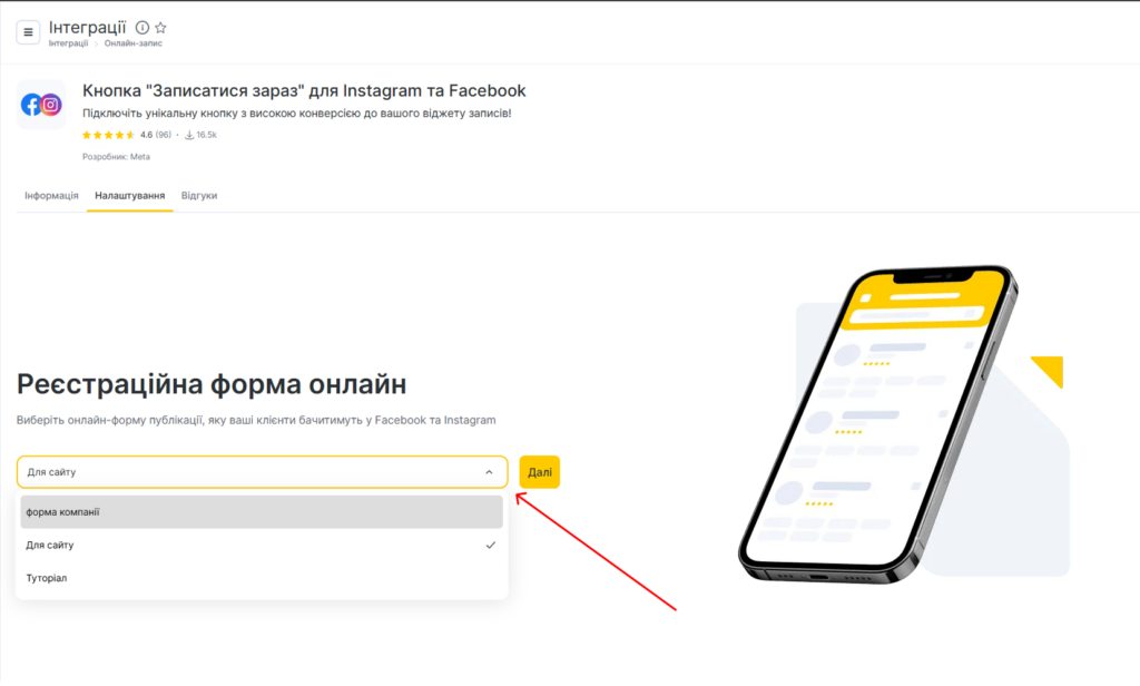 - Оберіть форму онлайн-запису, яку хочете бачити на своїй сторінці у Facebook або Instagram.