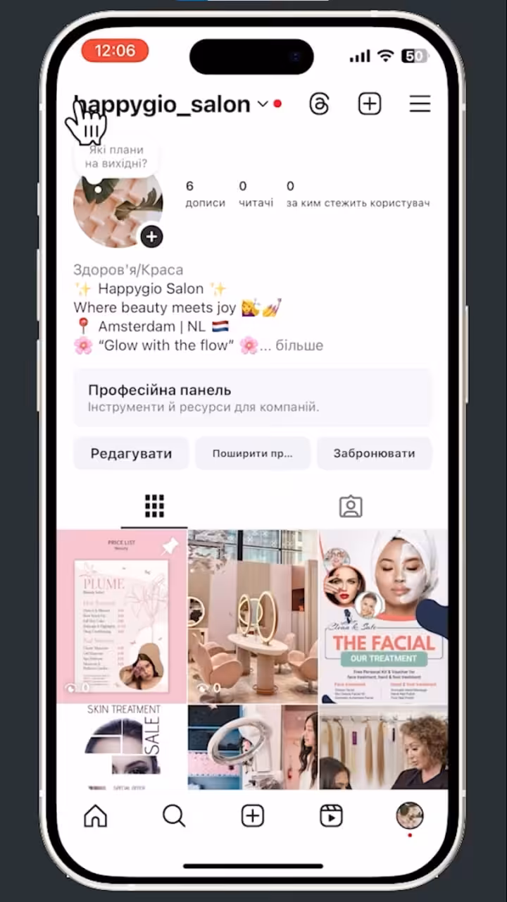 - Переконайтеся, що кнопка Записатися зараз активна й пов’язана з Altegio. Поверніться до свого профілю Instagram, щоб побачити кнопку Записатися зараз. Перевірте кнопку, щоб упевнитися, що вона спрямовує користувачів на вашу сторінку бронювання в Altegio.