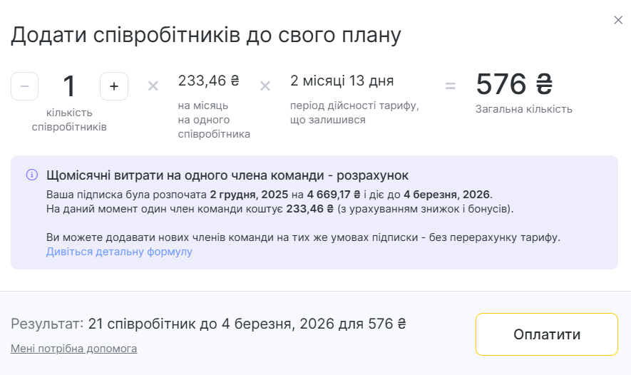 Вартість докупівлі співробітника розраховується автоматично на основі останньої придбаної ліцензії — без урахування попередніх ліцензій і їх бонусних місяців.
